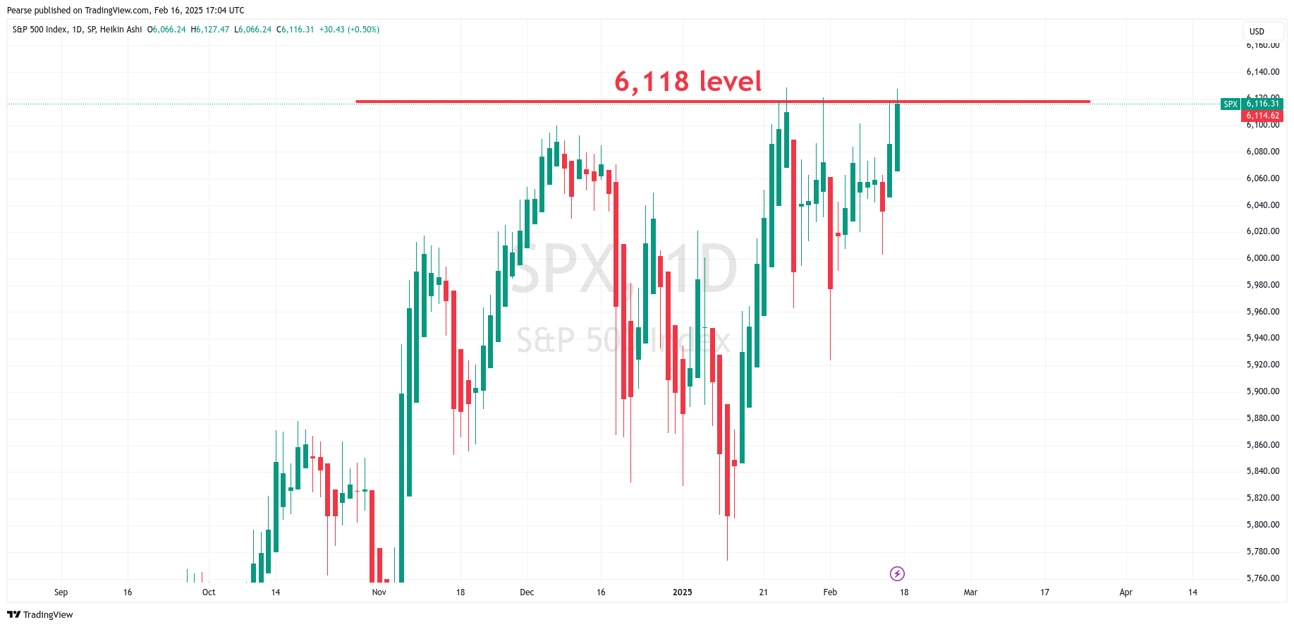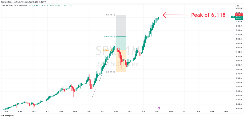 You can clearly see a projection the projected peak in the S&P500 of 6,118. Looking at an hourly chart during the week, you can see that everytime the price hits this level it bounces off. It’s too early to come to a conclusion but I’m beginning to think that this could be a peak.