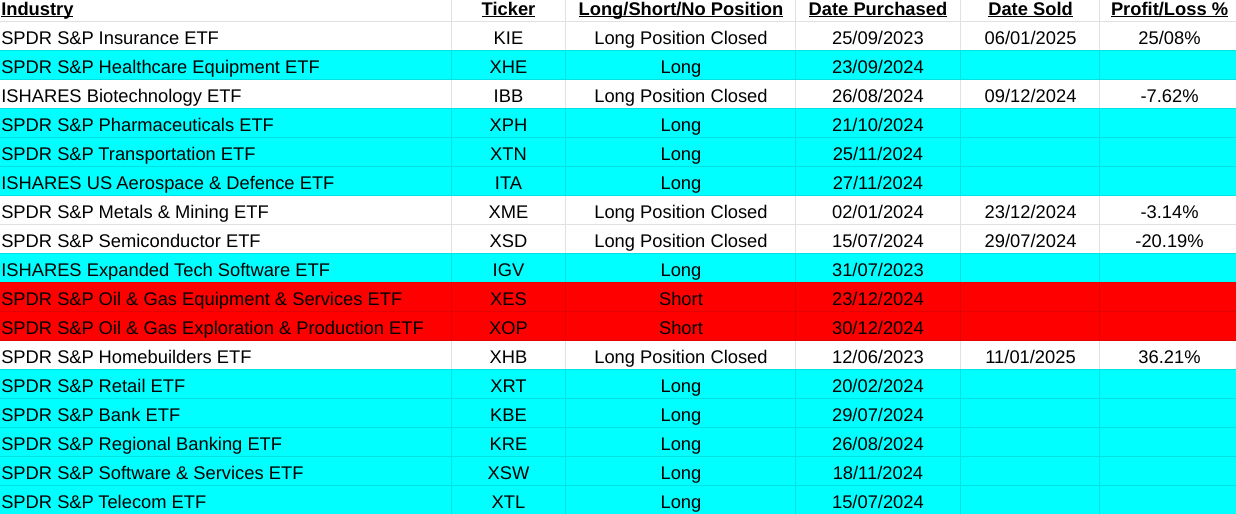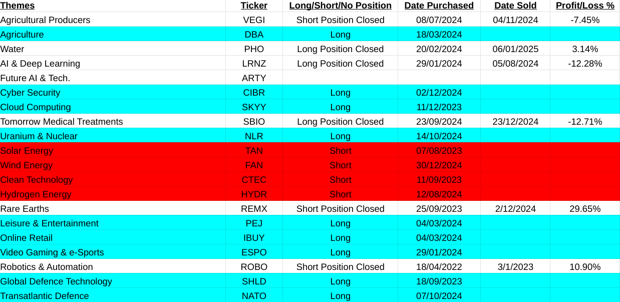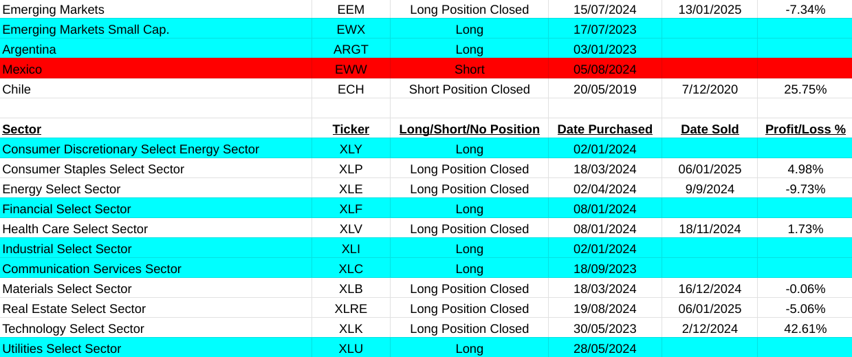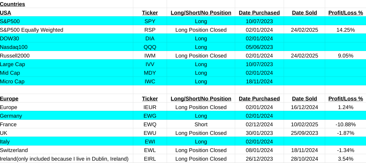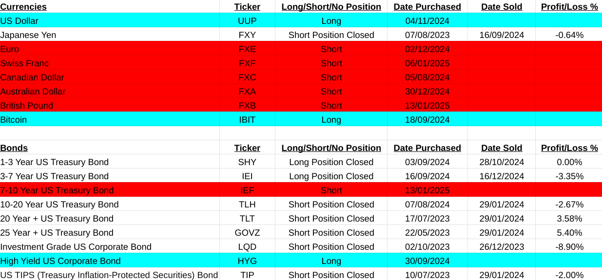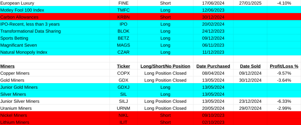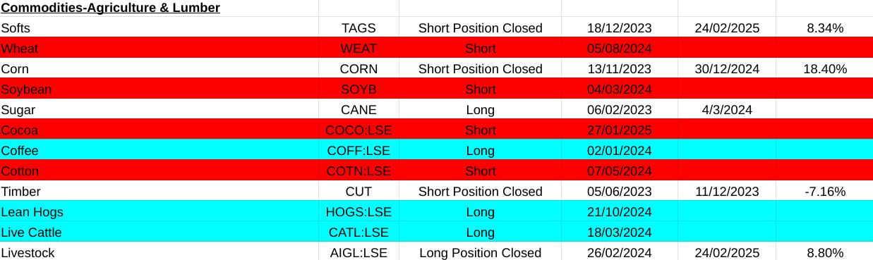 Were back on track this week. In the main asset list I am up 29.95% with the closure of long positions in Livestock(AIGL:LSE, +8.80%), Dow Jones Transportation Index(DJT, -10.49%), Russell 2000(IWM, +9.05%) and most importantly the equally weighted S&P500(RSP, +14.25%). Short position closed on Agriculture(TAGS, +8.34%). My main conclusion from this is that cracks are beginning to become very obvious with the US market. If you take away the distortions of the MAG7 list of companies in the S&P500 index you clearly see that it is beginning to falter. Compound that with a close signal on the Russell 2000 index of smaller companies and the Dow Jones Transportation Index selling off. There is something not so good beginning to work its way out.