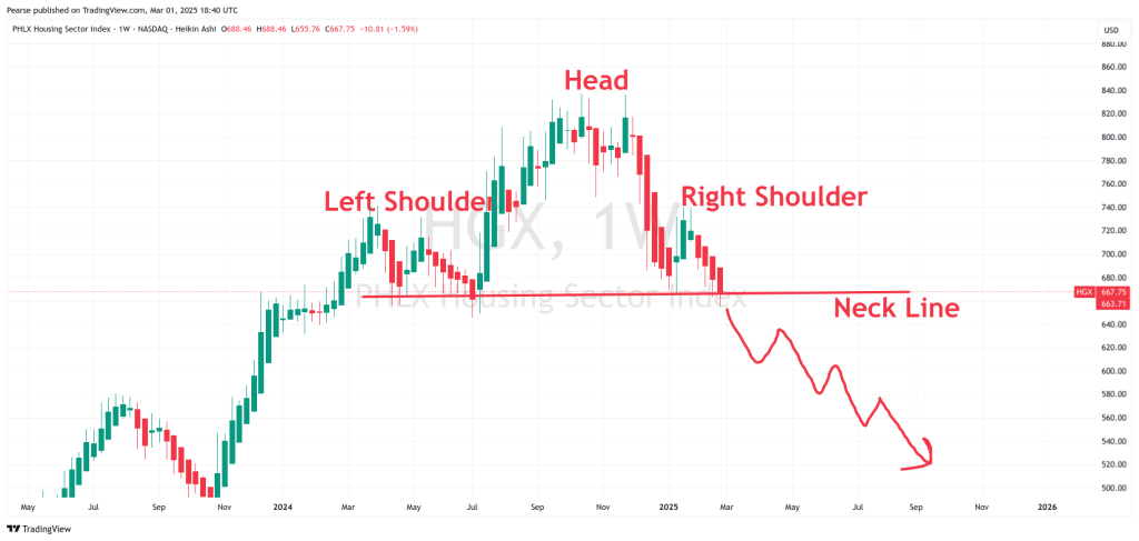 One final thing I came across was the US PHLX Housing Sector Index(HGX). There is a very noticeable bearish pattern that has nearly full formed called a head and shoulders pattern. It does not look good for US housing. Chart is at the end.