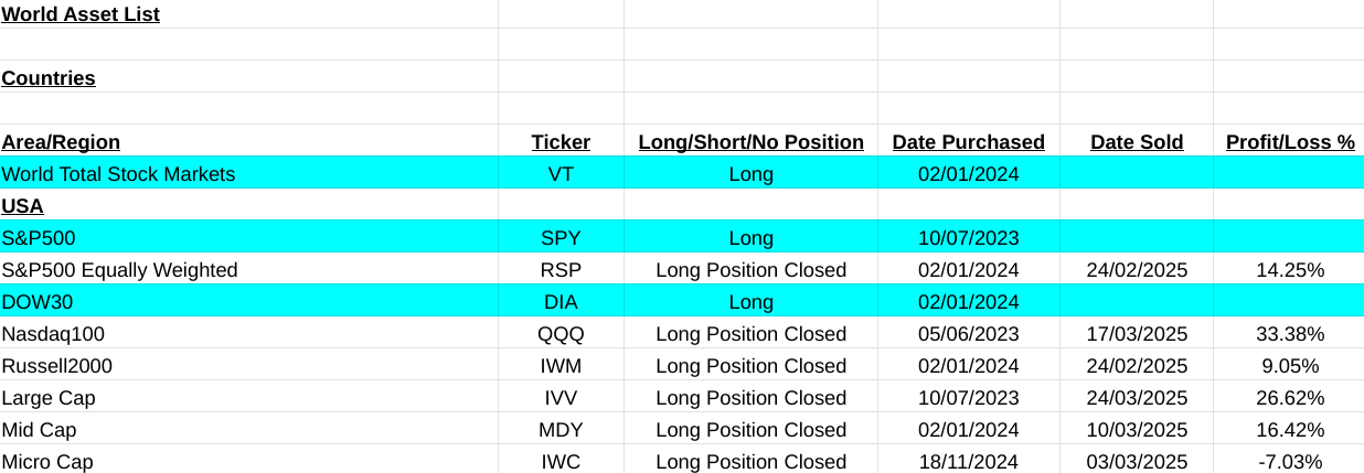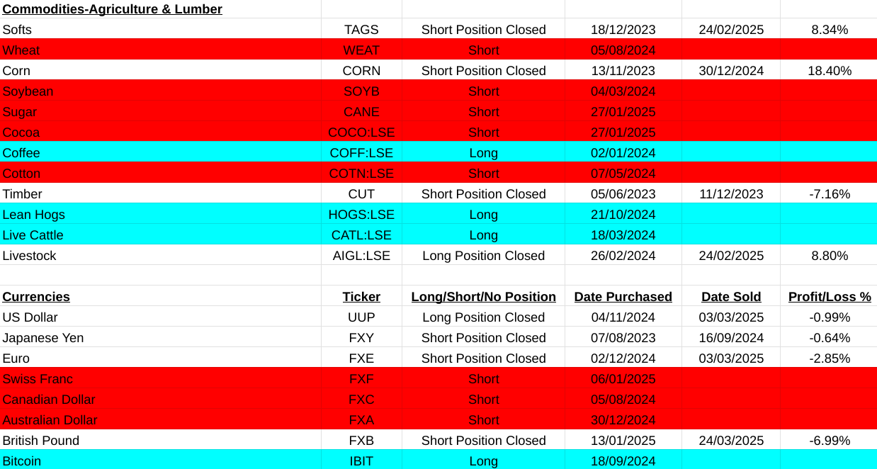 Main Asset ETF List. Short positions are marked in red, long in blue, neutral in white.