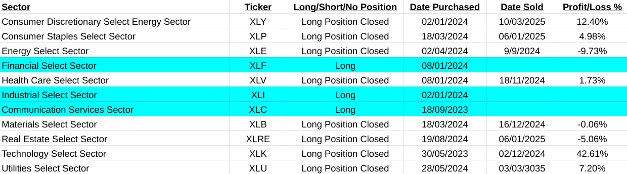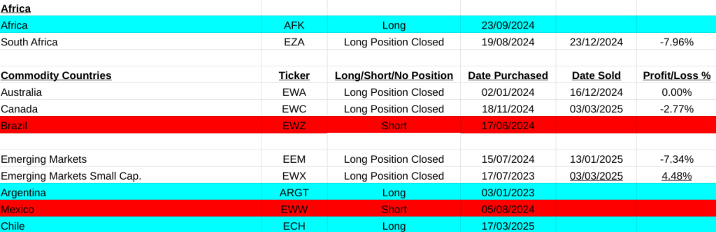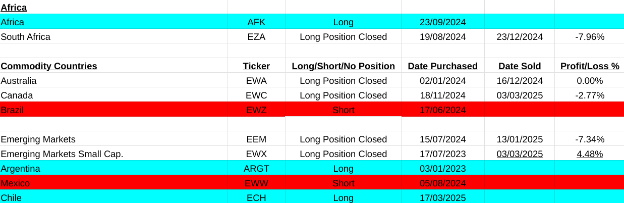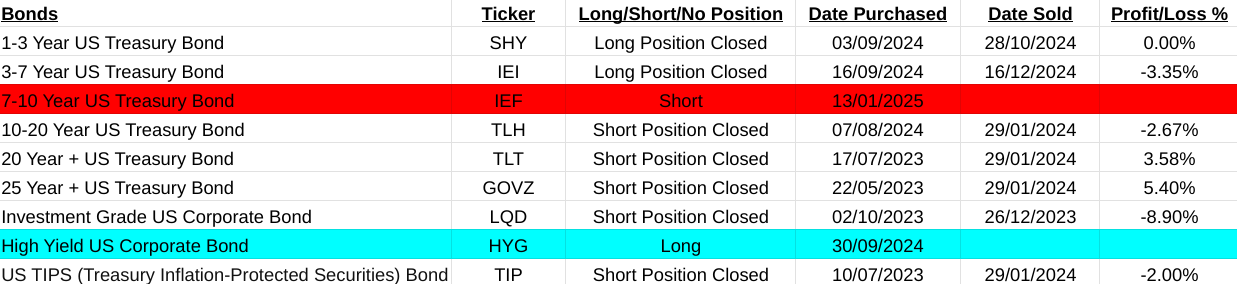 Note:The above trades do not take into consideration dividends on shares or coupons on bonds. This is important because if you short a stock or bond the dividend will be taken from you. Therefore the safest strategy is never to short any instrument only buy an upwardly trending security and simply close your position when this ends. These trades are my view on the market and not me advising you to take any of these positions. Closed positions have losses and profits listed in percentages. Mainly as a record to myself so I keep honest in evaluating my strategy.