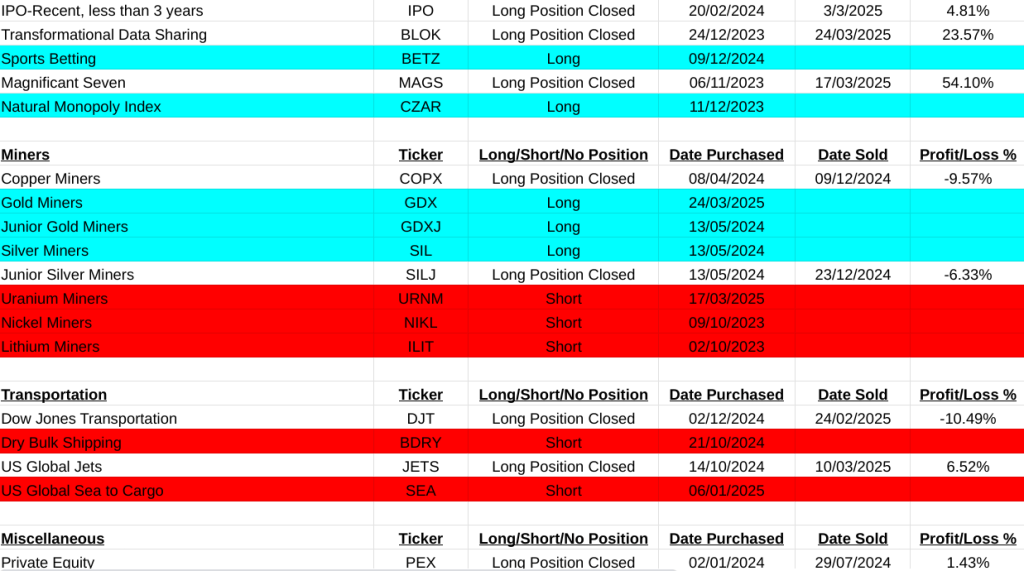 Insurance(KIE) is now a buy and Global Timber ETF(CUT) is a short. I forgot to mention last week that the UK ETF(EWU) is now a buy.