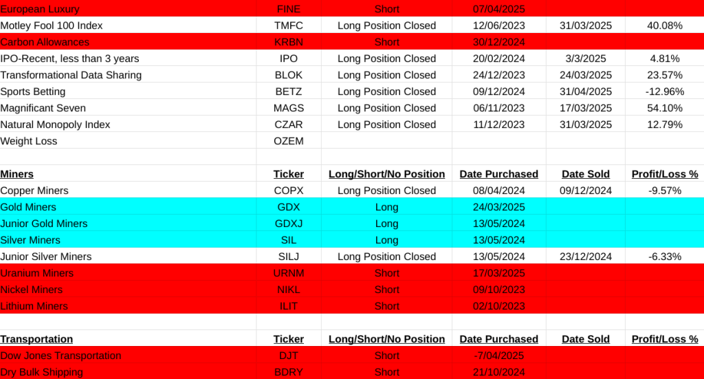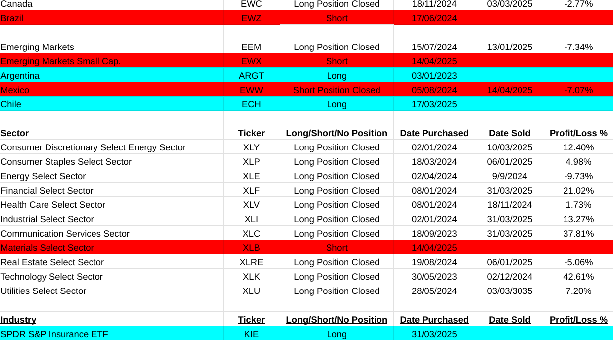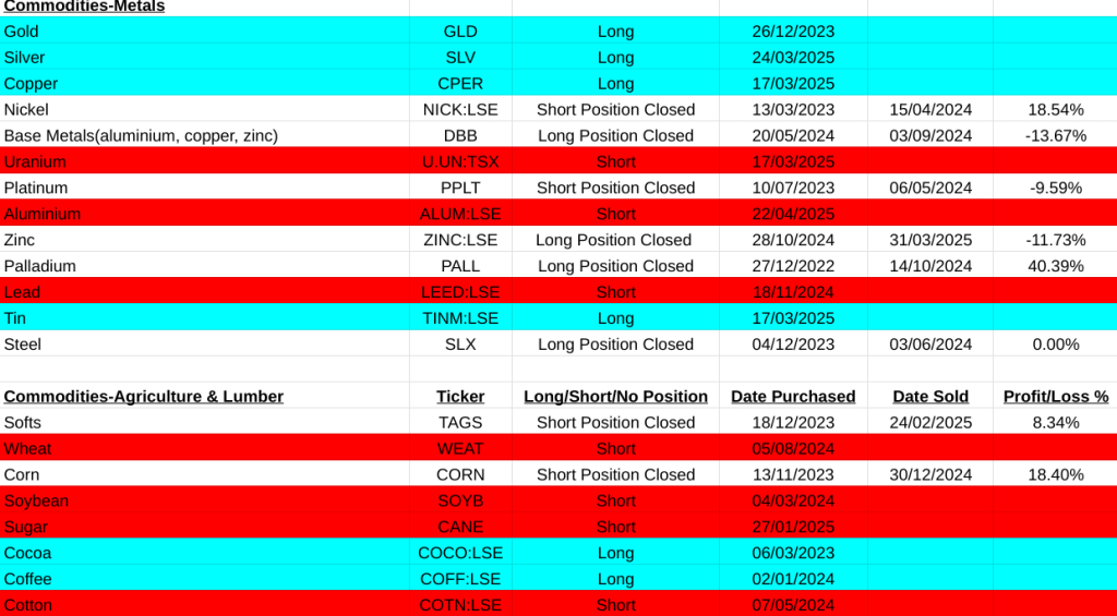Note:The above trades do not take into consideration dividends on shares or coupons on bonds. This is important because if you short a stock or bond the dividend will be taken from you. Therefore the safest strategy is never to short any instrument only buy an upwardly trending security and simply close your position when this ends. These trades are my view on the market and not me advising you to take any of these positions. Closed positions have losses and profits listed in percentages. Mainly as a record to myself so I keep honest in evaluating my strategy.