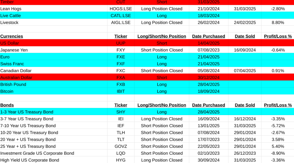 Main Asset ETF List. Short positions are marked in red, long in blue, neutral in white.