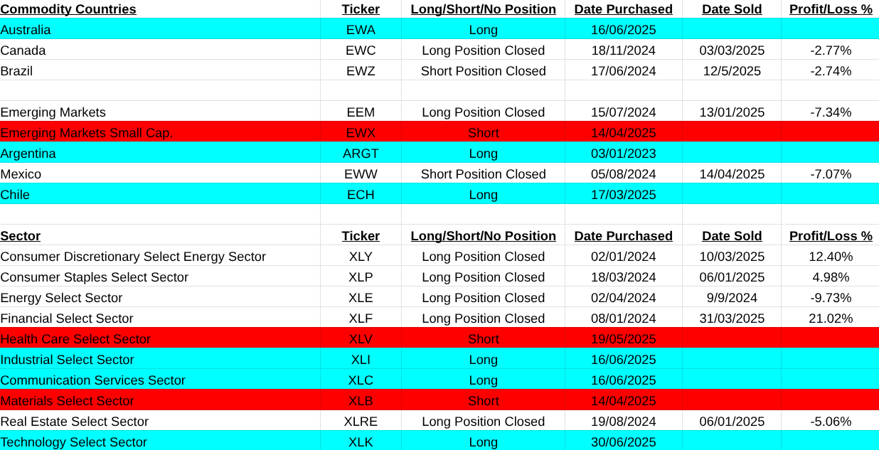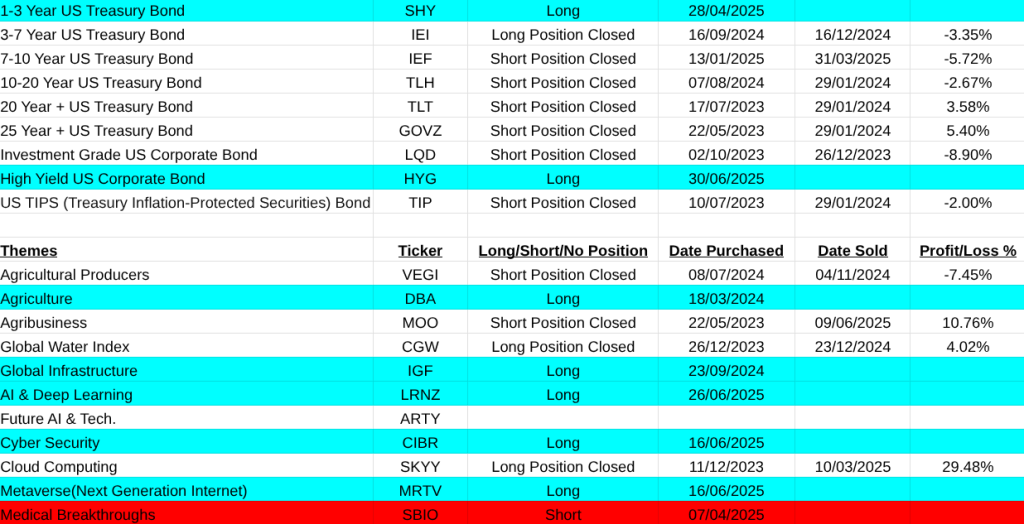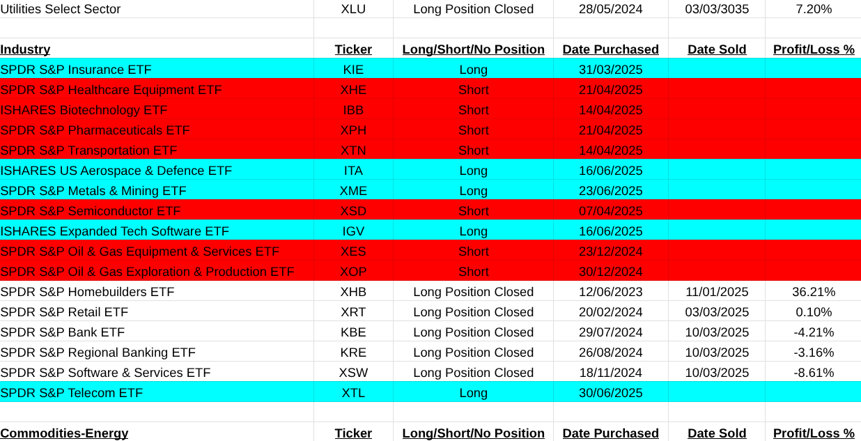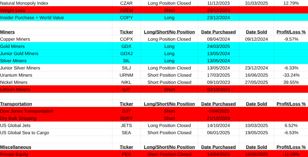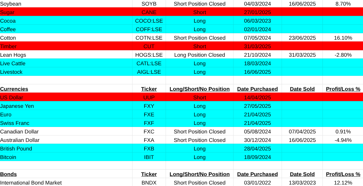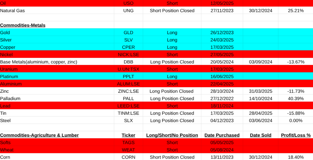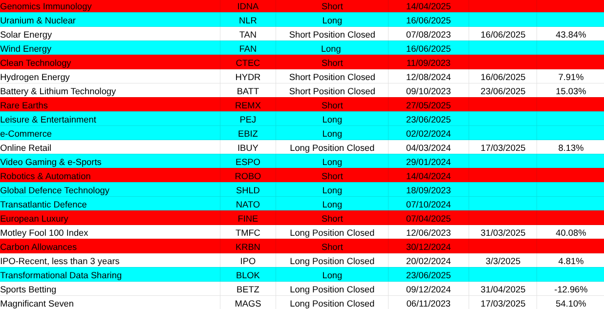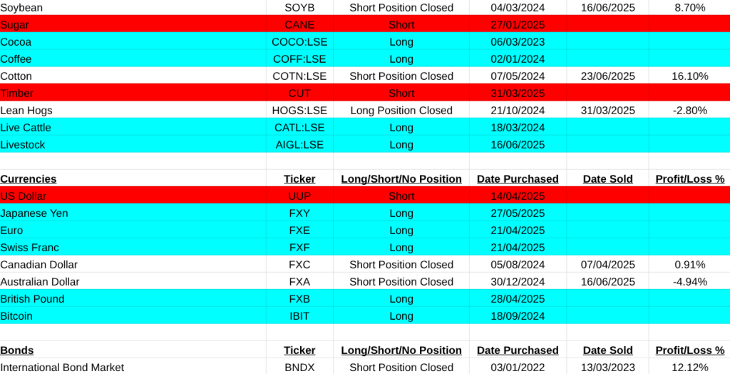 The main asset list didn’t suffer at all. Mainly because most of the products are etf’s and this waters down their movement. My worst loss here was a short on Uranium miners(URNM -33.24%). It was easily covered by a gain in Solar(TAN +43.84%). Others that closed were Cotton(COTN:LSE +16.10%, Battery Tech(BATT +15.03%), Soybeans (SOYB +8.70%), Hydrogen(HYDR +7.91%), Australian Dollar(FXA -4.94%).
