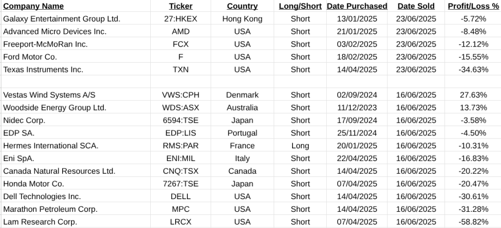 Regarding shares on the MSCI World Large Cap list this was a different story. My best trade was in Vestas Wind Systems +27.63% but my worst was in Lam Research Corp. -58.82%.