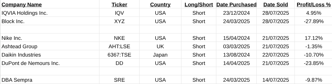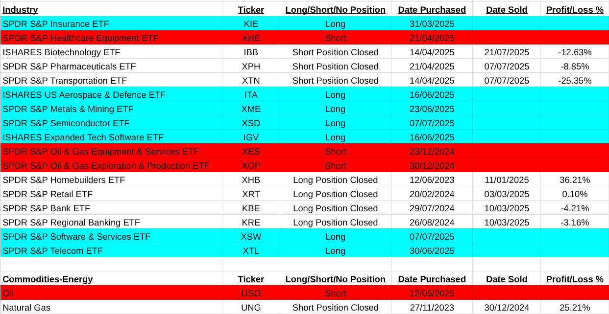 Note:The above trades do not take into consideration dividends on shares or coupons on bonds. This is important because if you short a stock or bond the dividend will be taken from you. Therefore the safest strategy is never to short any instrument only buy an upwardly trending security and simply close your position when this ends. These trades are my view on the market and not me advising you to take any of these positions. Closed positions have losses and profits listed in percentages. Mainly as a record to myself so I keep honest in evaluating my strategy.