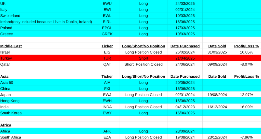 The market keeps going up no matter what. I closed and went short a lot of positions after Trumps Liberation Day. I was crushed in the ensuing rally and have now reversed most of the positions. That’s what they call a whipsaw and the price I pay for trend following with a slow model.