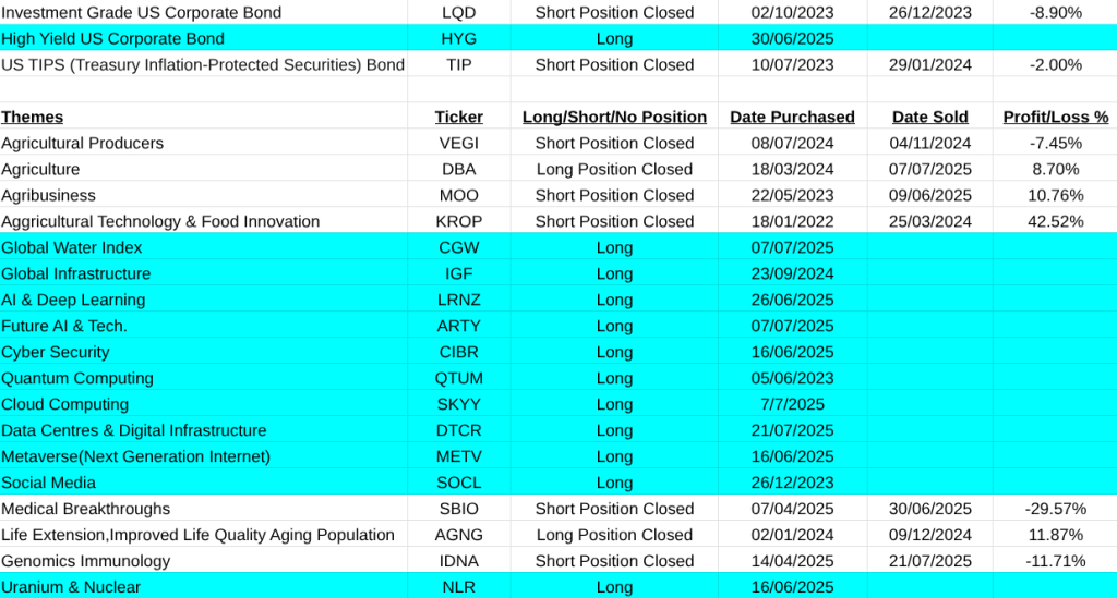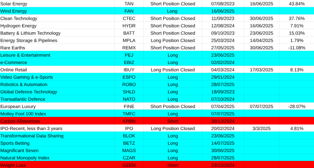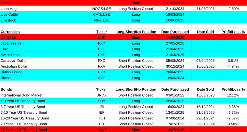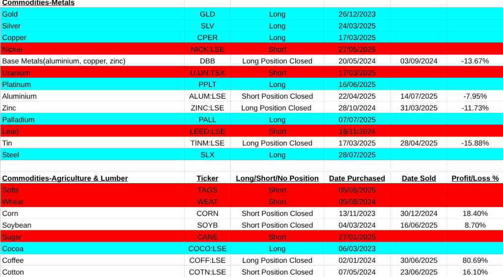 On my main asset list the miners are certainly coming alive, even Lithium(LIT:NYSE), my short position was closed for a profit of 56%. This highlights the disconnect between news and reality. You would imagine that lithium miners would have been a safe bet over the last few years but on average miners have dropped on average by over 64% since July 2023. Aluminium, Palladium, Steel are all now long’s and with that Canada and Emerging Markets.