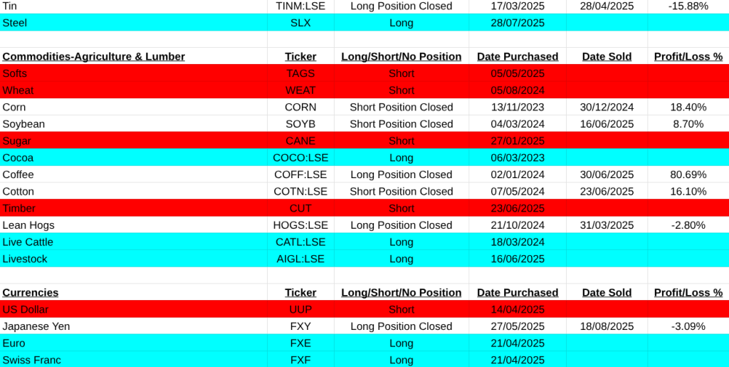 On the main asset list there were mainly buys, Emerging Markets Small Cap, Online Retail and the Russell 2000. Lithium, Nickel, Uranium and Copper Miners. Two sales in Global Carbon and Oil & Gas Equipment & Services.