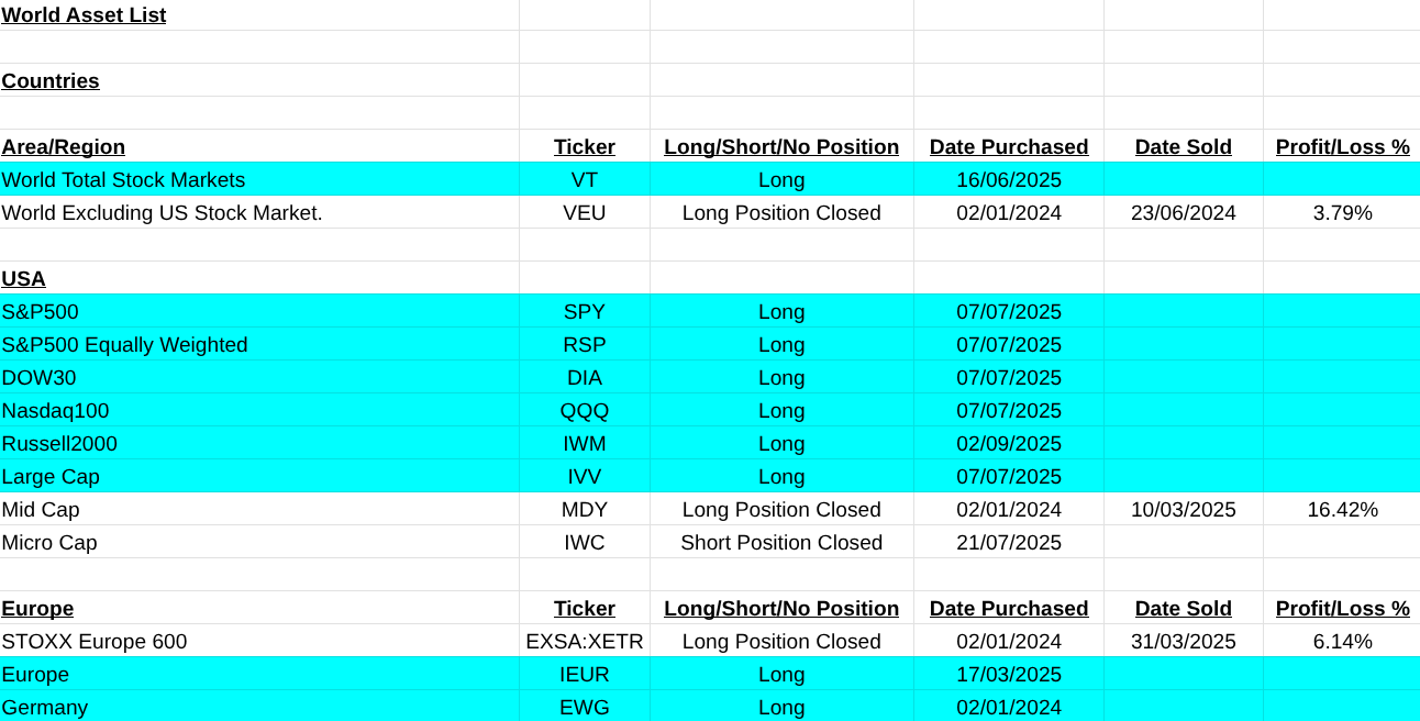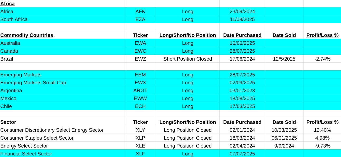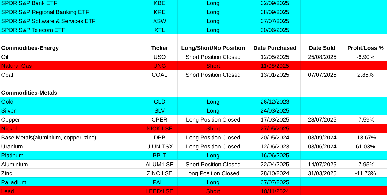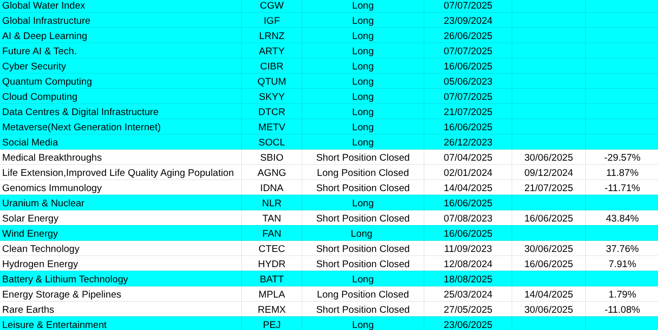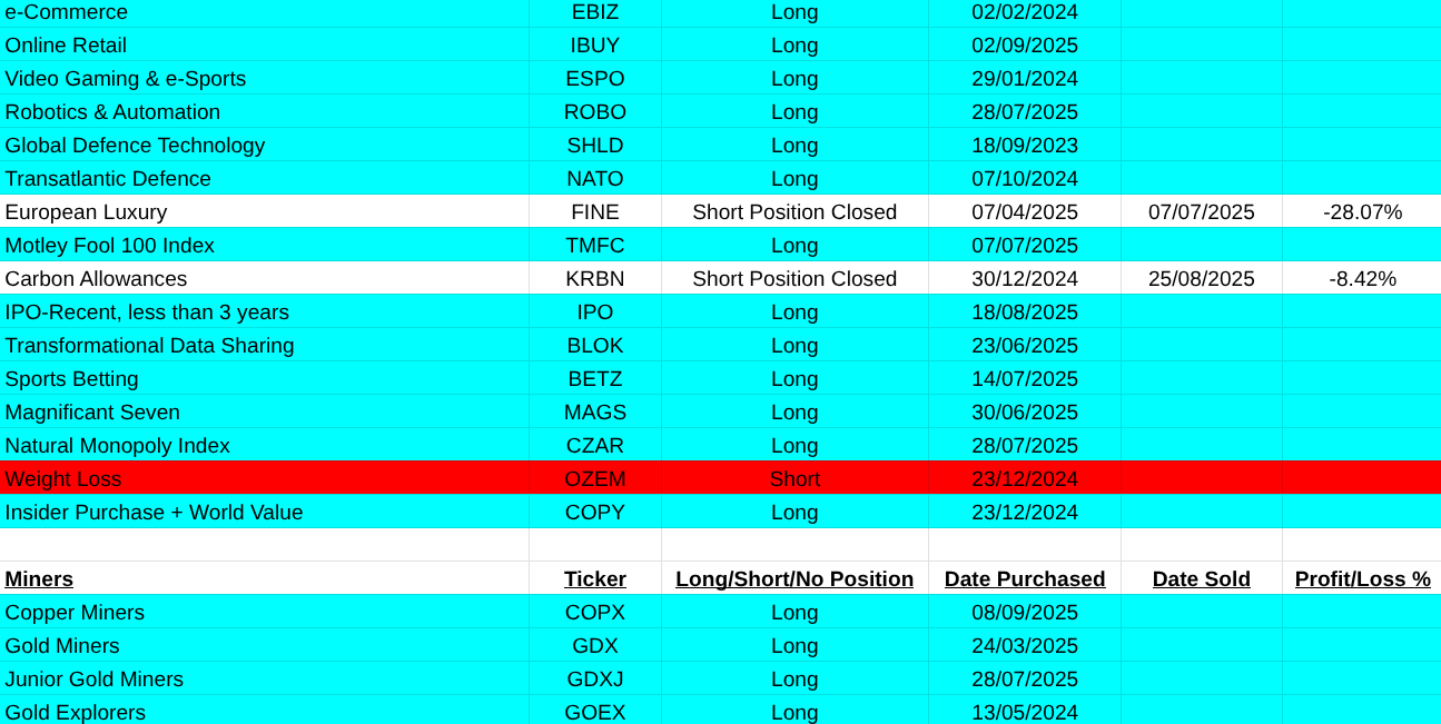 On the main asset list there were mainly buys, Emerging Markets Small Cap, Online Retail and the Russell 2000. Lithium, Nickel, Uranium and Copper Miners. Two sales in Global Carbon and Oil & Gas Equipment & Services.