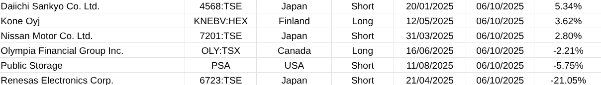 Note:The above trades do not take into consideration dividends on shares or coupons on bonds. This is important because if you short a stock or bond the dividend will be taken from you. Therefore the safest strategy is never to short any instrument only buy an upwardly trending security and simply close your position when this ends. These trades are my view on the market and not me advising you to take any of these positions.  Closed positions have losses and profits listed in percentages. Mainly as a record to myself so I keep honest in evaluating my strategy.