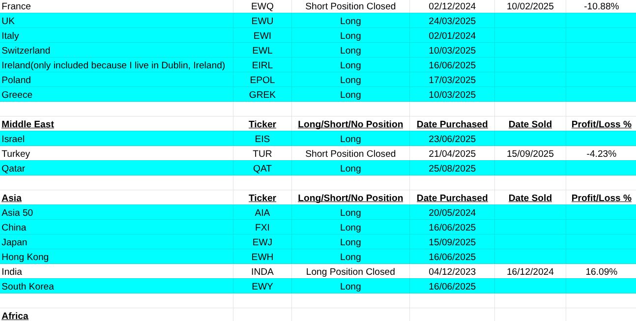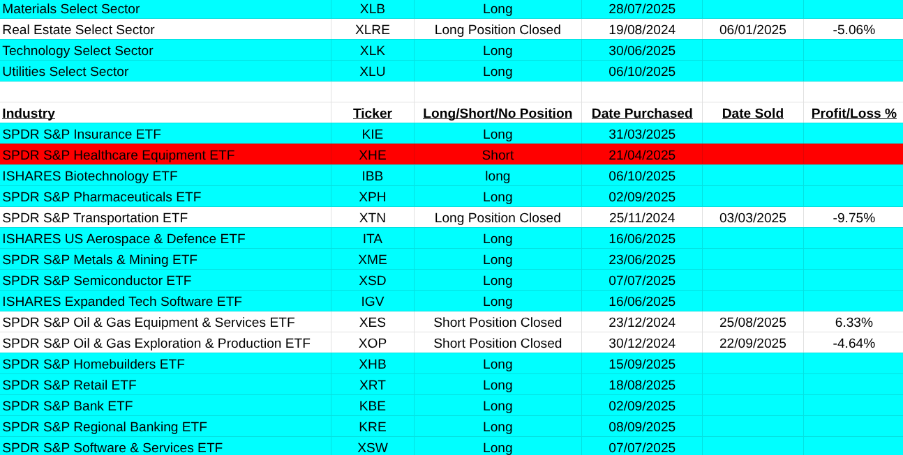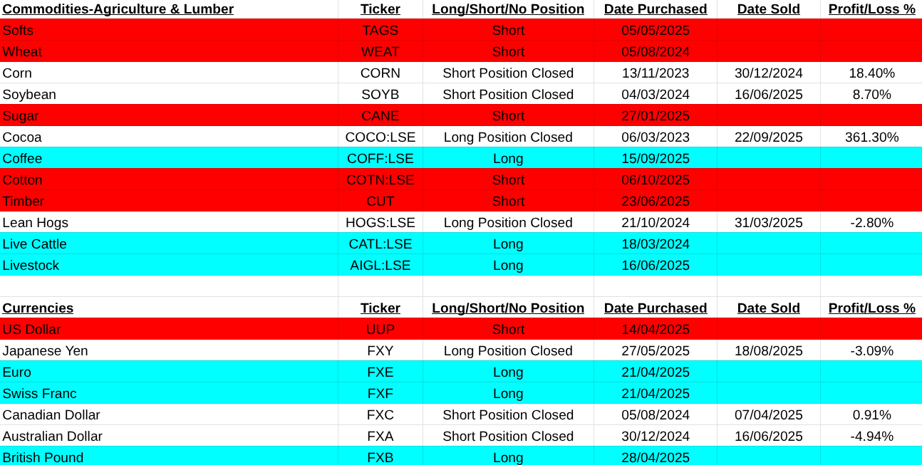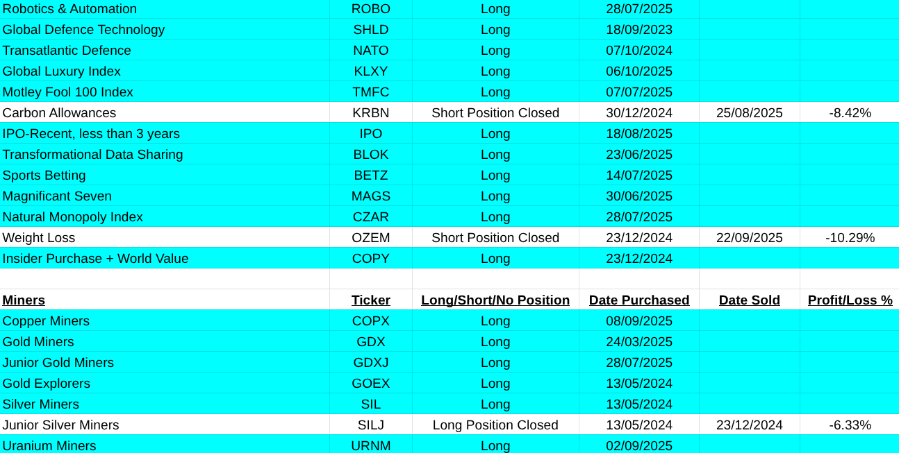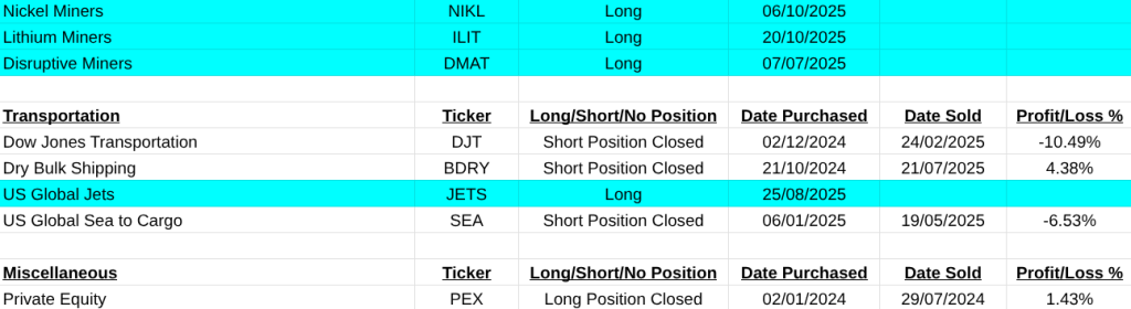 Lithium(ILIT) and Nickel Miners(NIKL) are now buys. This is interesting as the Lithium miners were a really bad investment over the last two years. Previously I had shouted them from October 2023 to July 2025 for a profit of 56%. So, it just goes to show that reading the papers during this period would have convinced you that lithium is booming. Well it was not but now its beginning to warm up.