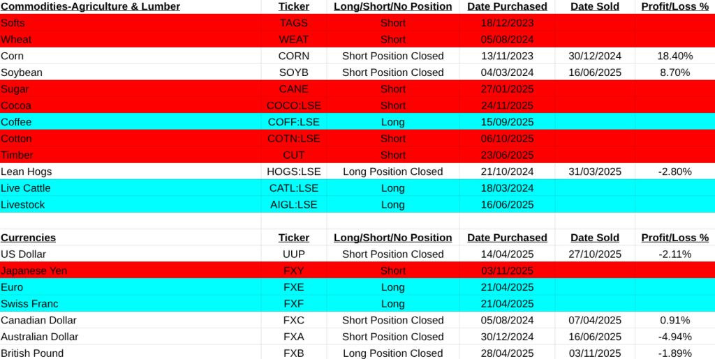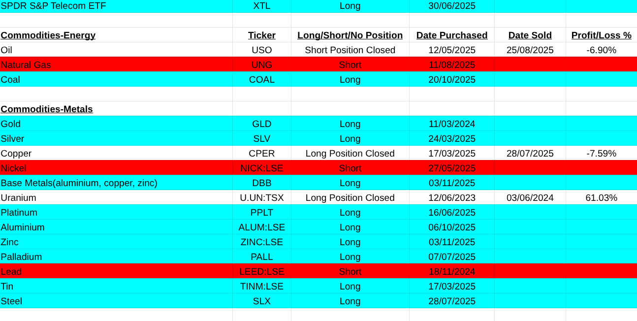 Note:The above trades do not take into consideration dividends on shares or coupons on bonds. This is important because if you short a stock or bond the dividend will be taken from you. Therefore the safest strategy is never to short any instrument only buy an upwardly trending security and simply close your position when this ends. These trades are my view on the market and not me advising you to take any of these positions. Closed positions have losses and profits listed in percentages. Mainly as a record to myself so I keep honest in evaluating my strategy.
