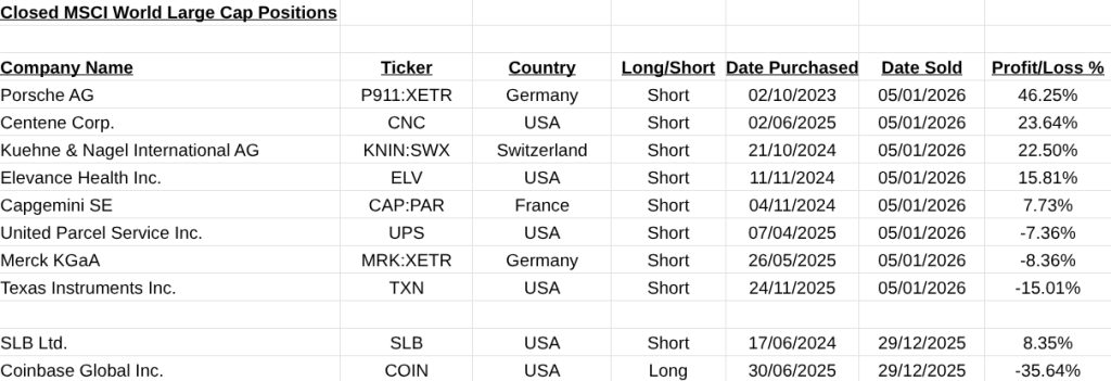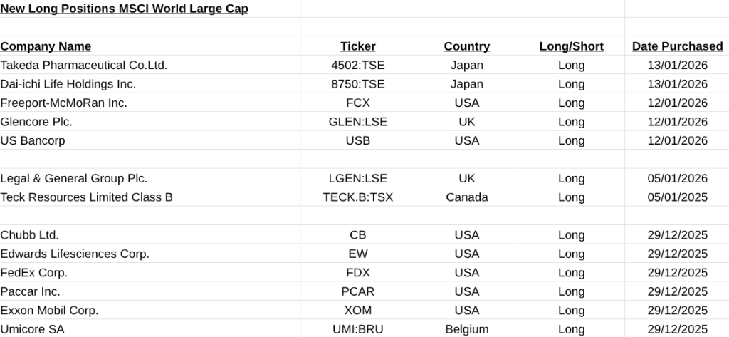 On the MSCI World Large Cap Shares front it was a very positive two weeks with substantial gains in Porsche(P911:XETR, +46.25%), Centene(CNC, 23.64%) and Kuehne & Nagle(KNIN:SWX, +22.50%).